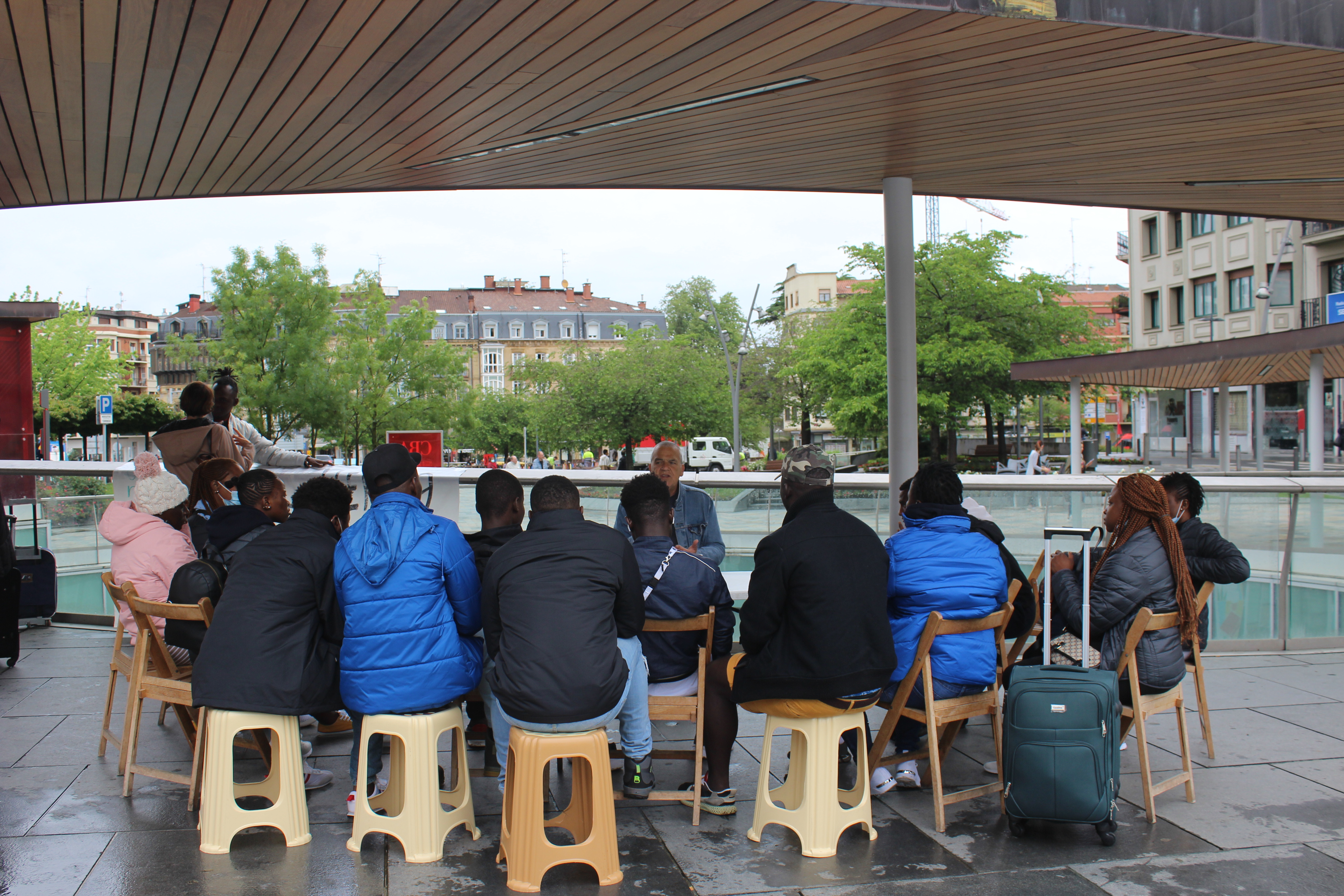 Así es, todos los días, a las diez de la mañana Ion e Iñaki abren una mesa plegable en la plaza San Juan, mientras Eva, Iosune y Allassane despliegan a su alrededor unas doce sillas de madera. A esa hora el colectivo ciudadano Harrera Irungo Sarea comienza a atender a las personas migrantes en tránsito que llegan hasta ese punto de información de quita y pon.